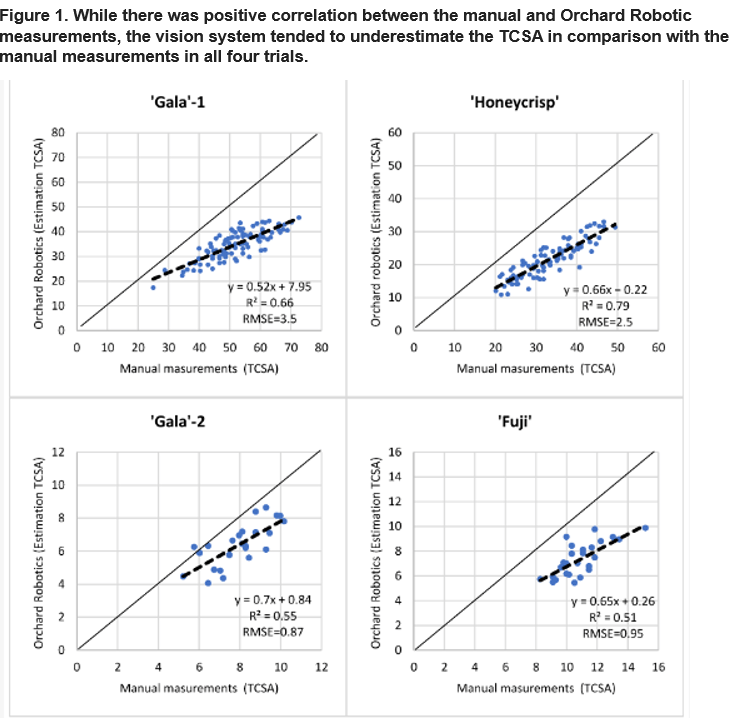 Precision crop load management of apple requires measuring trunks, counting flowers, fruitlets, or fruit at various times during the year to guide management decisions. While previous studies have found ways to incorporate these manual measurements into helpful orchard tools, time has often been a limiting factor in the adoption of these practices. There are an increasing number of tech companies working in agriculture that are incorporating these models into their portfolio. Our hopes are that the time required to collect the necessary data can be minimized so that more growers can have actionable information to manage their orchard more precisely.